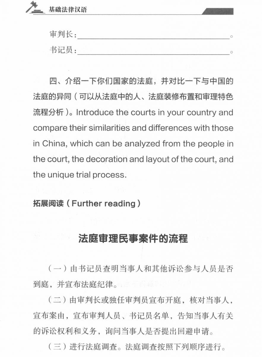 Trung tâm tiếng Trung Bắc Kinh giới thiệu sách Tiếng Hán pháp luật cơ sở được Nhà xuất bản Bắc Kinh xuất bản năm 2024, gồm 12 bài về các chủ đề: Tòa án; Ngày hiến pháp; Tranh chấp trong hôn nhân; Quyền lưu trú; Di cư; Phòng chống lừa đảo online; Tranh chấp trong giao thông; Tranh chấp trong công ty; Truyền thông pháp lý; Văn hóa pháp luật trong phim ảnh....